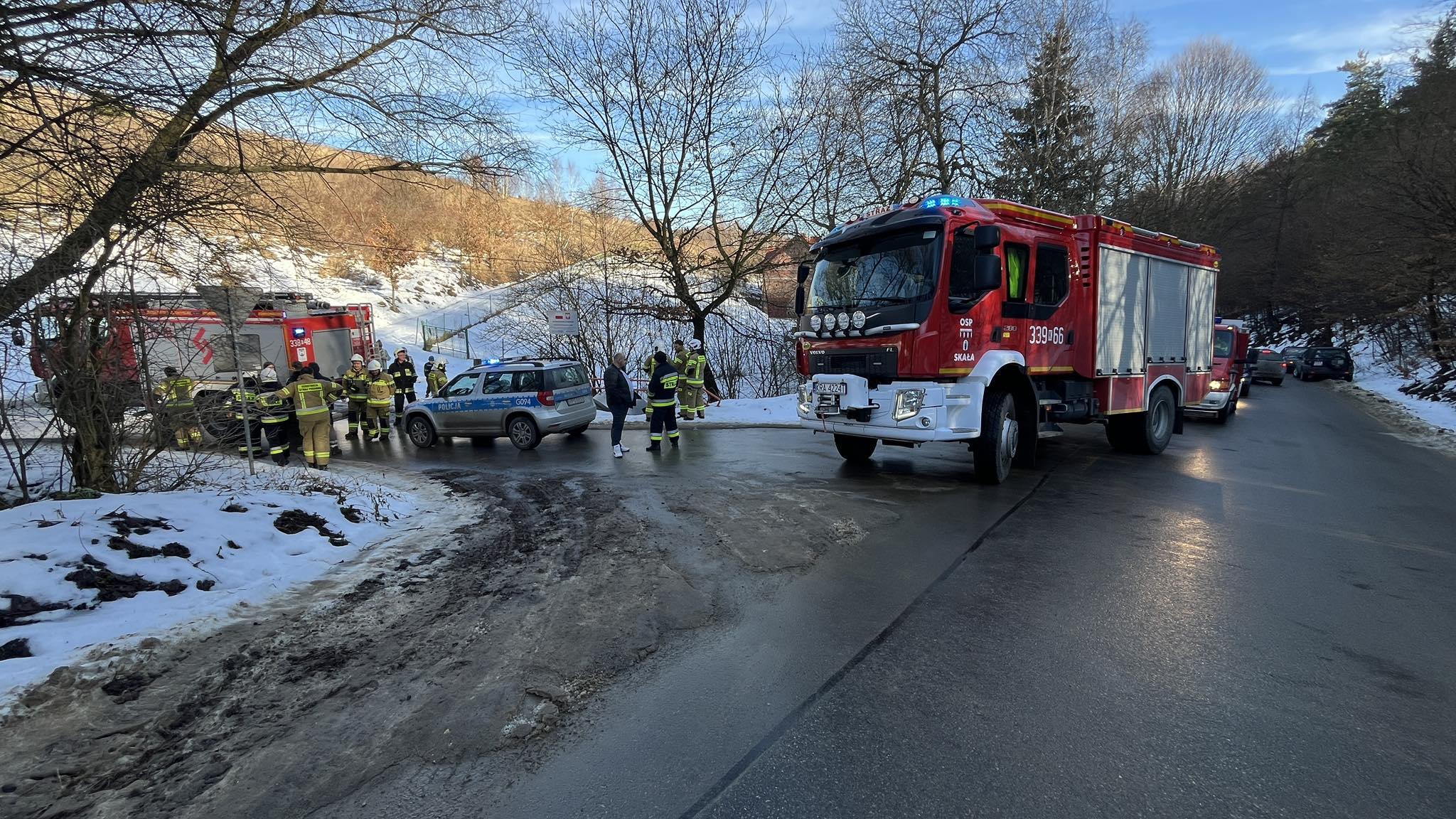 Kilka minut przed godziną 12-tą służby zostały zaalarmowane i zadysponowane do samochodu osobowego który wypadł z drogi. Na miejsce zadysponowano Osp Wola Kalinowska , Osp Sułoszowa I , Osp Skała, patrol policji ze Skały oraz ZRM Skała. Na szczęście nie było osob poszkodowanych w tym zdarzeniu. Apelujemy aby dostosować prędkość do warunków na drogach w szczególności w rejonach górskich oraz dolinach gdzie zalega śnieg a drogi pomimo, że są czarne miejscami mogą być śliskie.